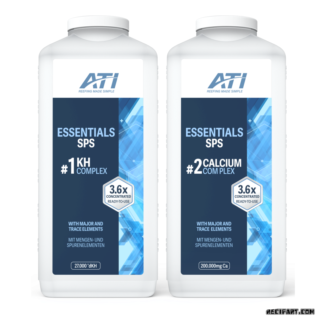 ATI Essentials SPS is an ultra concentrated duo specially formulated for aquariums dominated by SPS corals. It guarantees rapid growth, intense coloring and water chemistry perfectly stable.