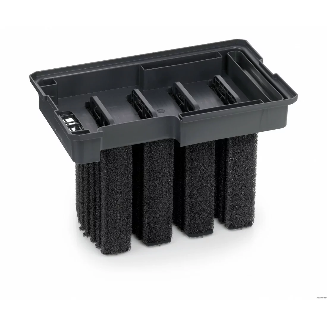 Dopo la prefiltrazione, l'acqua attraversa diverse spugne di filtrazione, ognuna avente una funzione specifica nell'eliminazione delle particelle fini e dei rifiuti organici. Infine, l'acqua risale attraverso un livello di bioballs, dei supporti di colonizzazione batterica che favoriscono la degradazione biologica degli inquinanti. 🦠
