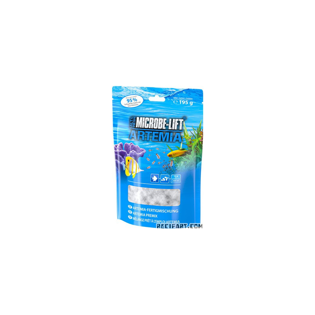 Artemia 195g mišinys leidžia lengvai išauginti krevetes iš Artemia sūrymo dėl paruošto naudoti mišinio, kuriame yra druskos ir kiaušinių. Jis idealiai tinka žuvims, koralams ir bestuburiams šerti.